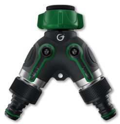 Med Grimsholm 2-vägs krankoppling med på/av kan du enkelt koppla två anslutningsenheter till en vattenkran/källa. När den väl är ansluten kan flödet enkelt och individuellt regleras för de två utgångarna.